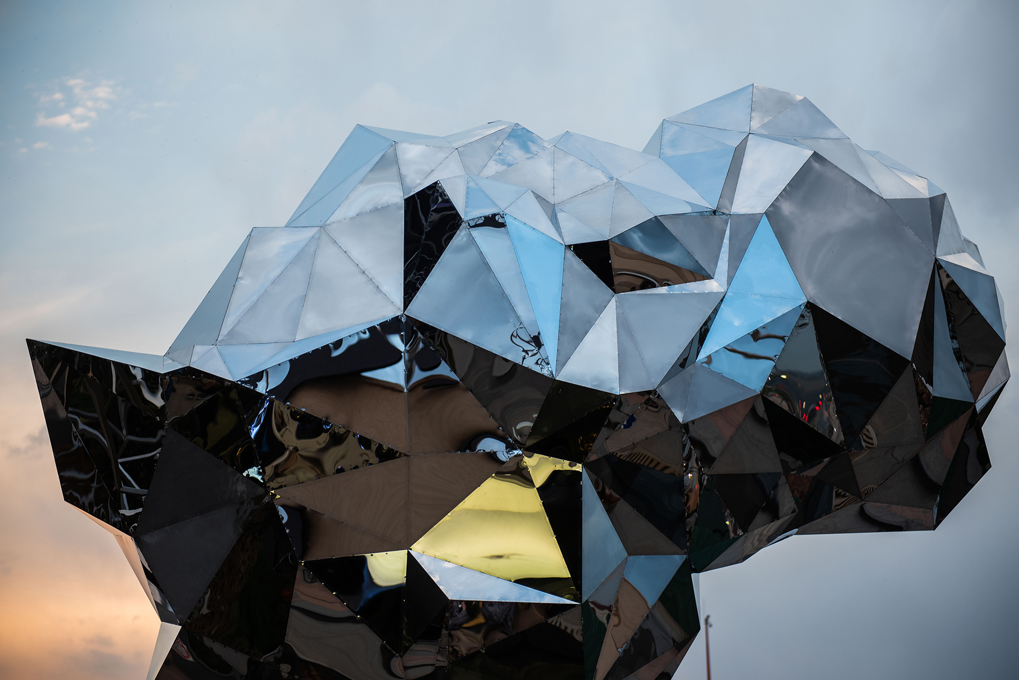 The line motif presents Africa as construct: an outline or construction presenting an emergent continent in a skeletal form. This construct is built from 320 pieces of 30 mm thick square bar combining grade 304 and 316 stainless steel. Mirroring the line construct, the faceted sculpture is shaped by 608 triangulated stainless steel plates crystallising into reflections, built from imported super mirror finish 3 mm thick grade 304 stainless steel plate. Each structure measures 5.5 m high, 5.27 m wide and 2.3 m in depth.