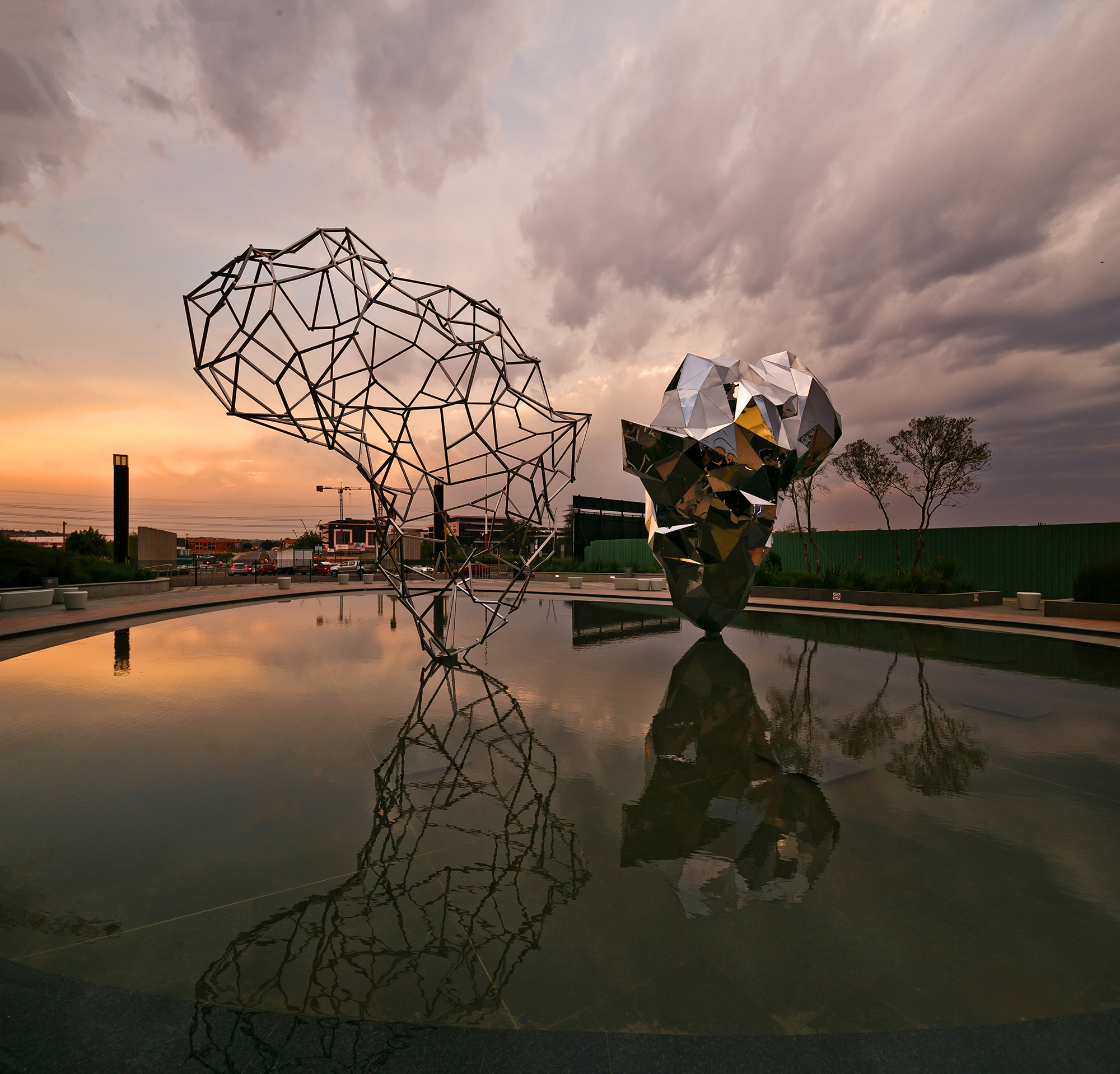 The line motif presents Africa as construct: an outline or construction presenting an emergent continent in a skeletal form. This construct is built from 320 pieces of 30 mm thick square bar combining grade 304 and 316 stainless steel. Mirroring the line construct, the faceted sculpture is shaped by 608 triangulated stainless steel plates crystallising into reflections, built from imported super mirror finish 3 mm thick grade 304 stainless steel plate. Each structure measures 5.5 m high, 5.27 m wide and 2.3 m in depth.