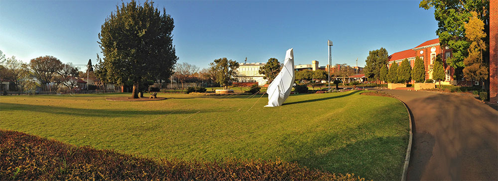 The installation Pinned Transitory II was developed in 2014 and is made of steel, tensile materials, rope, cord and tent pegs. The artwork investigates and questions ideas of permanence. The bird motif becomes a metaphor of a fluid African identity and refers to the adapter, traveller or nomad.